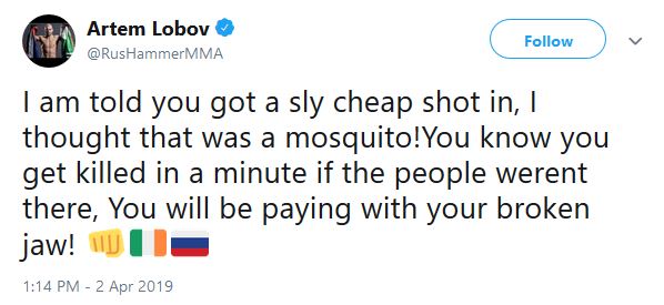 “I am told you got a sly cheap shot in, I thought that was a mosquito!You know you get killed in a minute if the people weren’t there, You will be paying with your broken jaw!” @RusHammerMMA
