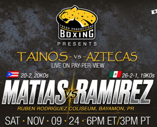 The anticipated return of Matías headlines a stellar event presented by Fresh Productions, where all undercard fighters will face top Mexican contenders. Taínos vs. Aztecas will be distributed live by ppv.com/iN Demand, starting at 6 p.m. ET / 3 p.m. PT in the United States, Canada and Puerto Rico on both cable and satellite pay per view.