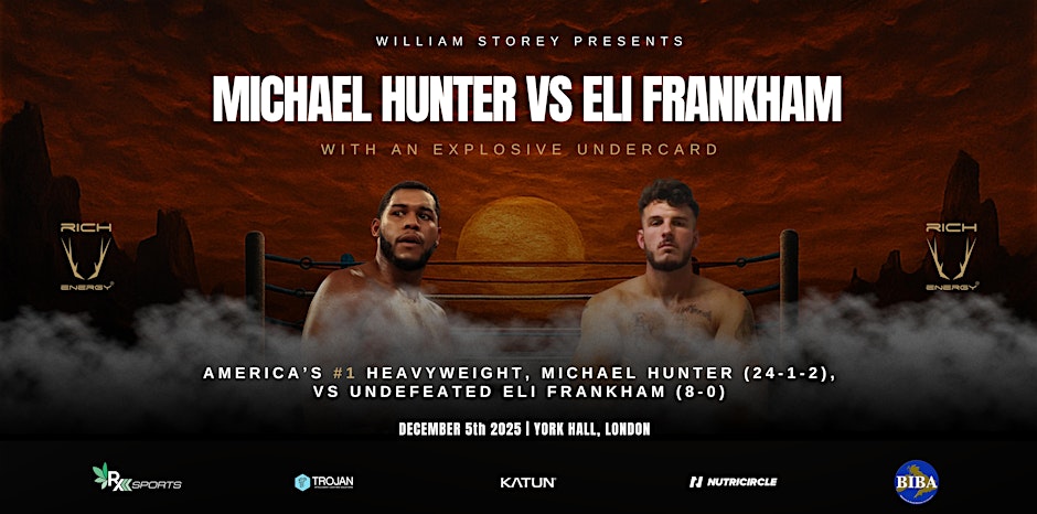 On Friday 5th December 2025 Michael ‘the Bounty’ Hunter versus Eli ‘Fatboy’ Frankham headlines the William Storey promoted Rich Energy event at the iconic York Hall in Bethnal Green, London.